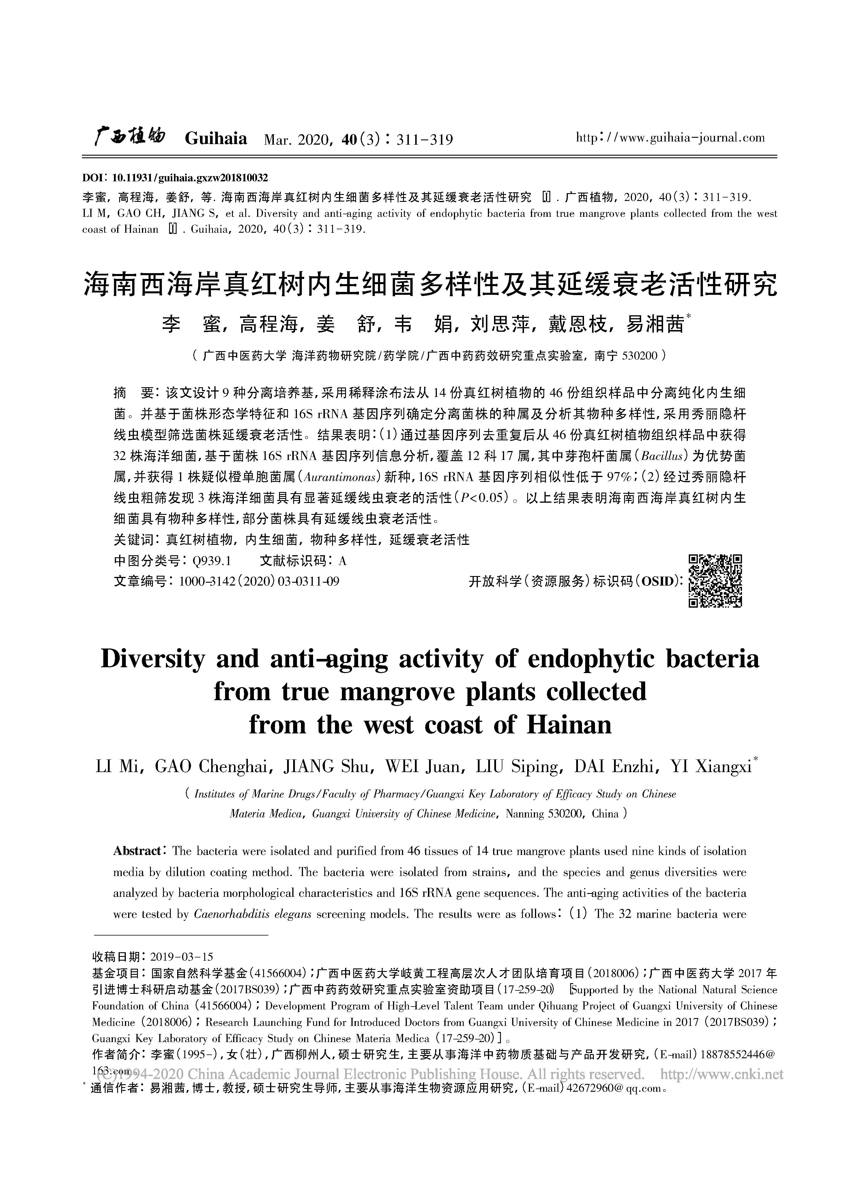 2020-海南西海岸真红树内生细菌多样性及其延缓衰老活性研究