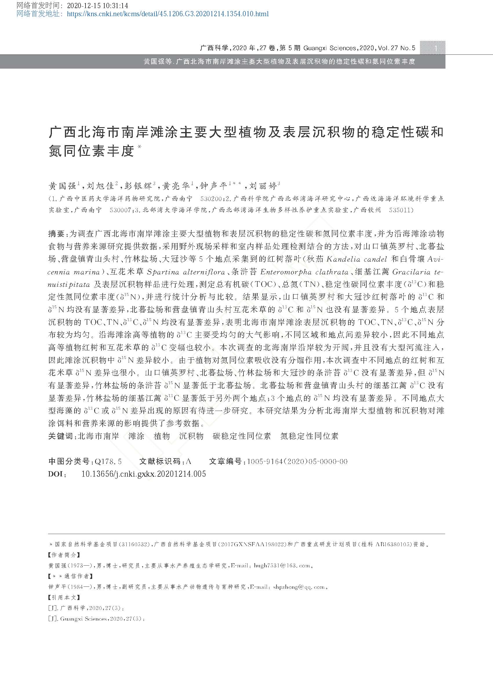 2020-广西北海市南岸滩涂主要大型植物及表层沉积物的稳定性碳和氮同位素丰度
