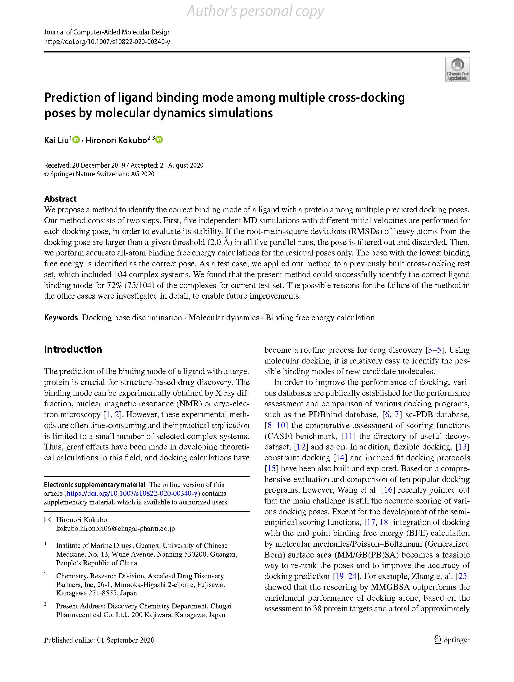 2020-Prediction of ligand binding mode among multiple cross-docking poses by molecular dynamics simulations 发布时间:2021-01-18 14:54:06 浏览次数: 次 【字体:小 大】 分享到: 【打印正文】