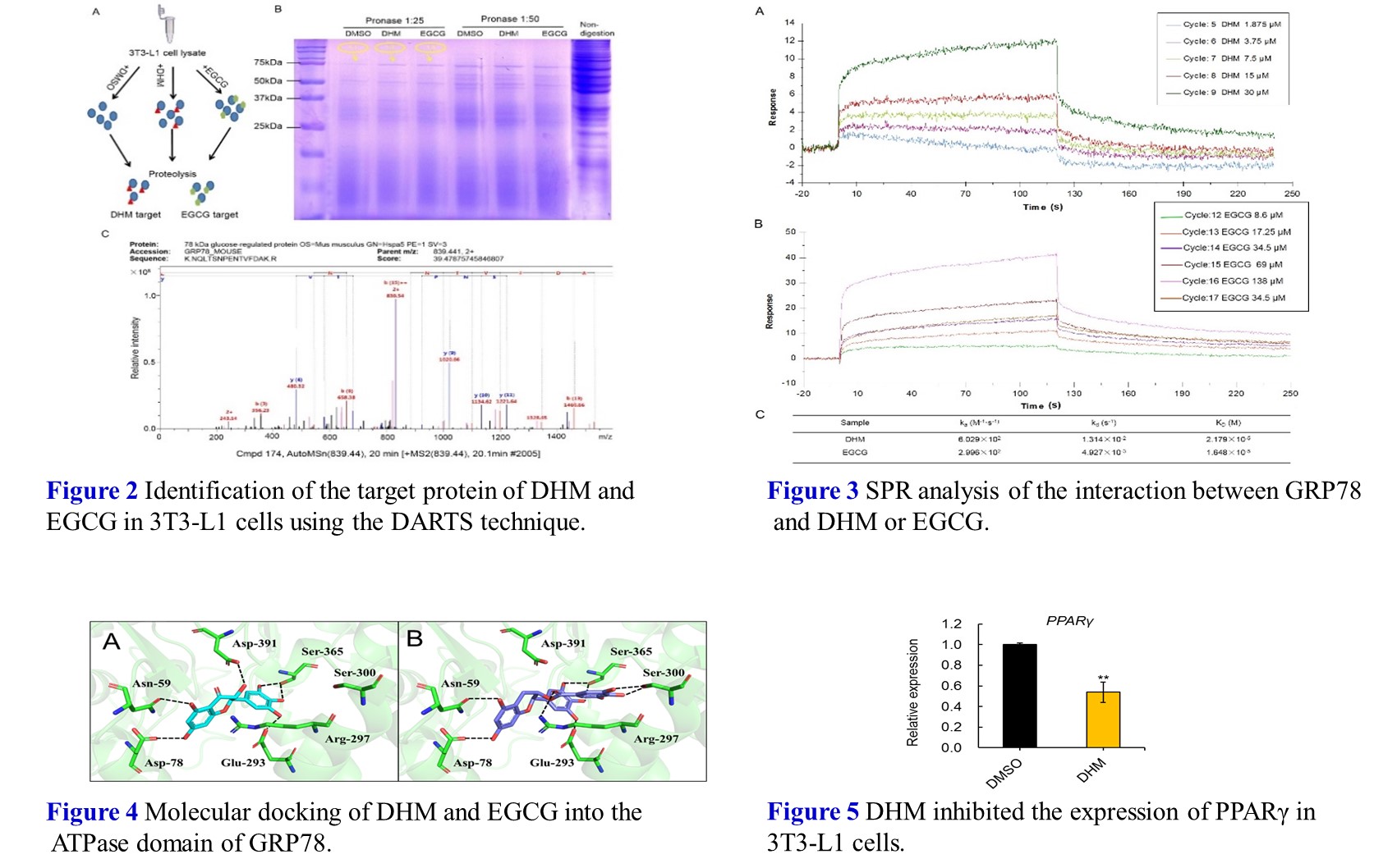 在抗肥胖药物作用分子机制研究中,通过药物亲和反应的靶点稳定性(DARTS)、表面等离子体共振(SPR)实验和Western blot等实验发现了Dihydromyricetin (DHM)、EGCG可以直接作用于肥胖的潜在新靶点GRP78,具有显著的降脂功能(Figure 2-5)。目前正在开展动物实验对该靶点的体内实验做进一步的生物学验证,针对GRP78抗肥胖作用的上下游机制开展深入研究。这些分子作用机理的研究,将为我们在动物、细胞和分子水平了解抗肥胖药物的作用途径和作用机制提供线索。后续研究中,将以GRP78蛋白作为靶点进行药物筛选。通过结构修饰等明确其构效关系,进一步筛选出安全性更好,专一性更强的天然化合物。