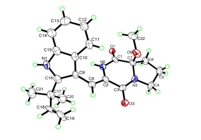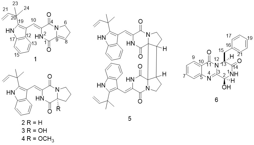 肖泽恩博士课题组对来源于海南东寨港红树林自然保护区红树无瓣海桑的内生真菌Aspergillussp. HNY16-5C进行规模发酵,对其代谢产物进行了分离纯化和结构鉴定,获得了6个二酮哌嗪类衍生物,分别为brevianamide K(1)、brevianamide V(2)、(R)-brevianamide Q(3)、(R)-brevianamide R(4)、asperginulin A(5)和brevianamide M(6)(图1);利用MptpB酶抑制活性模型,对化合物1~6进行了活性测试,首次发现化合物1具有较强的MptpB酶抑制活性,具有开发为抗结核分枝杆菌药物的巨大潜力。