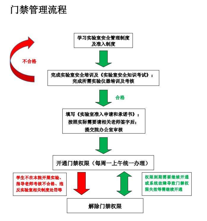 第一条 进入实验室进行科研实验的申请人(包括:教师、研究生、本专科生以及进修人员等)需填写《海洋药物研究院实验室准入申请和承诺书》,经各个实验室负责人、楼层负责人、研究室负责人及研究院负责人同意后方可开通门禁权限进入。