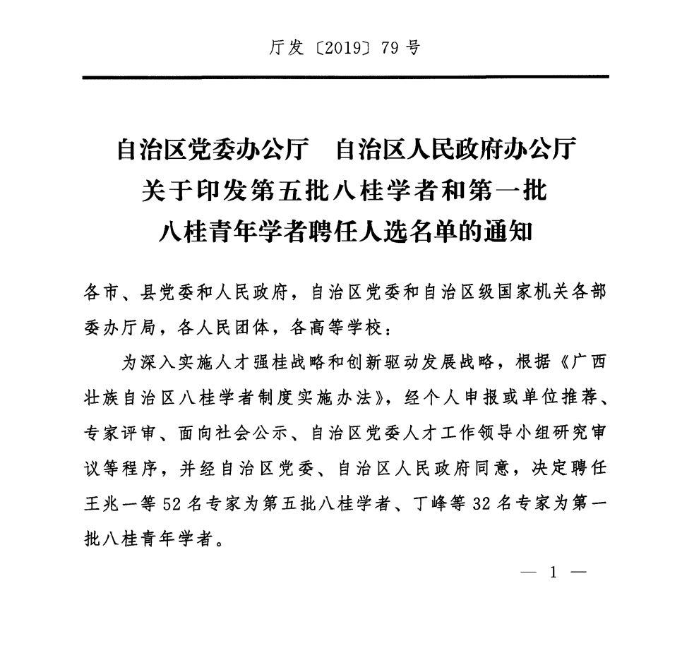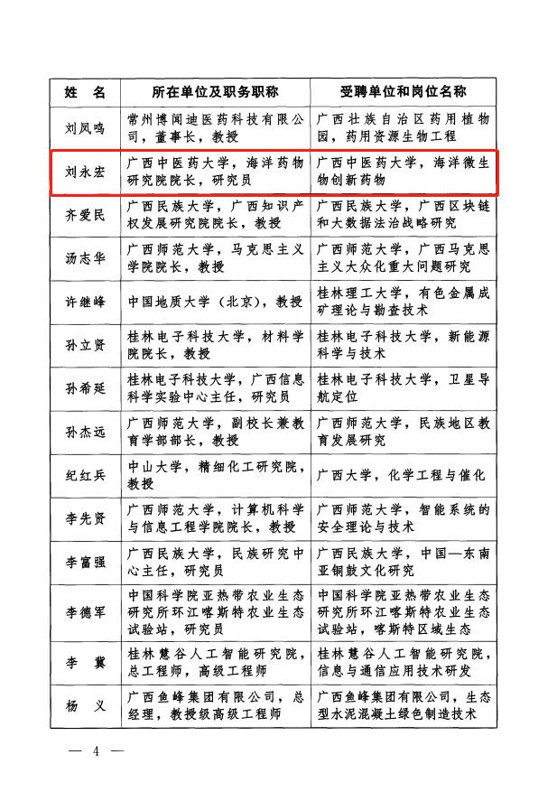 近日,中共广西壮族自治区委员会办公厅、自治区人民政府办公厅印发第五批八桂学者和第一批八桂青年学者名单,Beat365中国唯一官方网站海洋药物研究院院长刘永宏研究员受聘为广西第五批八桂学者。