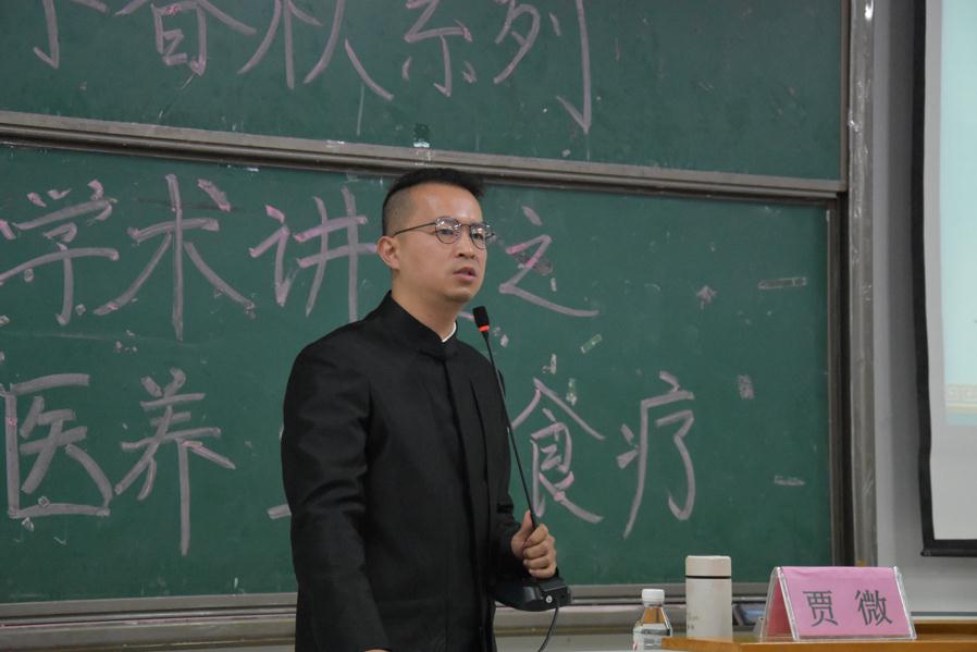 贾微在同学们热烈的掌声中走上讲台,他幽默风趣的开场白赢得了同学们的阵阵掌声。贾微针对中医养生以及食疗的概念、目的、意义和具体方法进行了具体的解说。他解说的养生方法简单易行,具有很强的可操作性,表现出极高的实用价值。尤其是贾老师对冬天养生方法进行指导时现场模拟养生保健动作,活灵活现地为同学们展示了冬天养生保健的具体要点。他还利用自身丰富的临床经验来对同学们冬天的皮肤健康问题提出宝贵的建议。现场同学反应热烈,在互动环节上贾老师详细地回答了同学们提出的冬天如何保持手脚温度,如何养胃等一系列冬天养生问题。