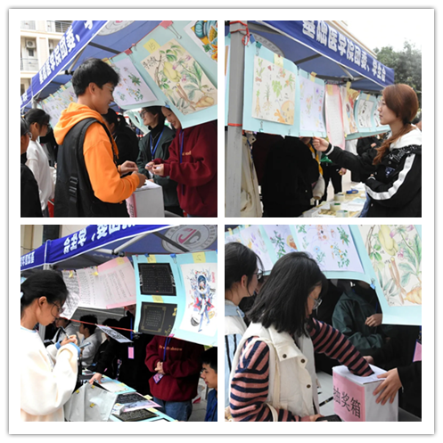 本次比赛分为初赛和决赛两个环节。活动之初,同学们热情高涨,积极踊跃地报名参与。参赛作品内涵丰富,主题鲜明,风格各异。书法组的作品矫若惊龙、行云流水;绘画组的作品色彩艳丽、构图巧妙。风吹过纸张,带得线条浮动,那些笔墨绘出的中草药似复活了一般,充满生机,跃然纸上。进入初赛的122份绘画作品和298份书法作品经过工作人员的初选,最终有22份绘画作品和38份书法作品进入决赛。进入决赛的作品通过线上线下投票和评委打分,最终决出获奖名单。12月4日在五合食堂门口进行现场展示和线下投票,同学们纷纷驻足欣赏,工作人员热情地引导同学们进行投票,活动开展得井然有序。