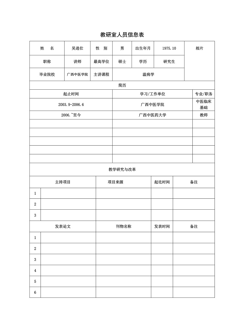 从事中医温病学教学、临床和科研工作20余年,自1999年7月至2003年8月在从事临床实践工作,2003年9月至2006年6于在Beat365中国唯一官方网站师从三代御医之传人艾军教授、博士生导师,攻读硕士研究生,获医学硕士学位,2006年7月至今在广西中医大学温病学教研室历任助教、讲师。主要研究方向温病热郁瘀相关病机理论与临床研究。创新擅长融会贯通把内经、伤寒论、温病学等中医经典融为一炉进行教学工作;并把温病理论运用到临床实践中。主持校级科研课题2项,公开发表学术论文10余篇。