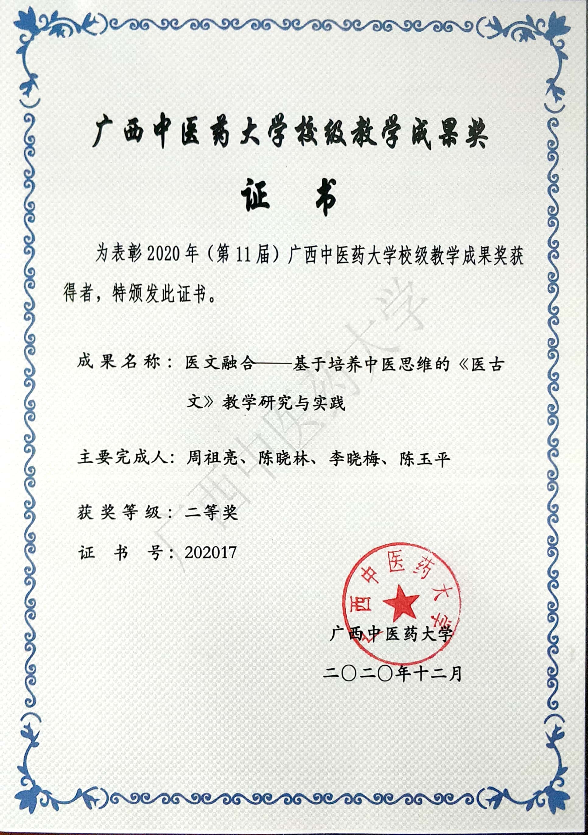 我教研室荣获第11届校级教学成果奖 来源:本站原创 作者:医古文教研室 发布时间:2021-12-07 15:07:14 浏览次数: 次 【字体:小 大】 近日,第11届Beat365中国唯一官方网站校级教学成果奖评比结果公布,医古文教研室由周祖亮教授主持,陈晓林、李晓梅、陈玉平老师参与完成的教学成果“医文融合——基于培养中医思维的《医古文》教学研究与实践”荣获二等奖。 获奖证书(扫描件) 分享到: 【打印正文】