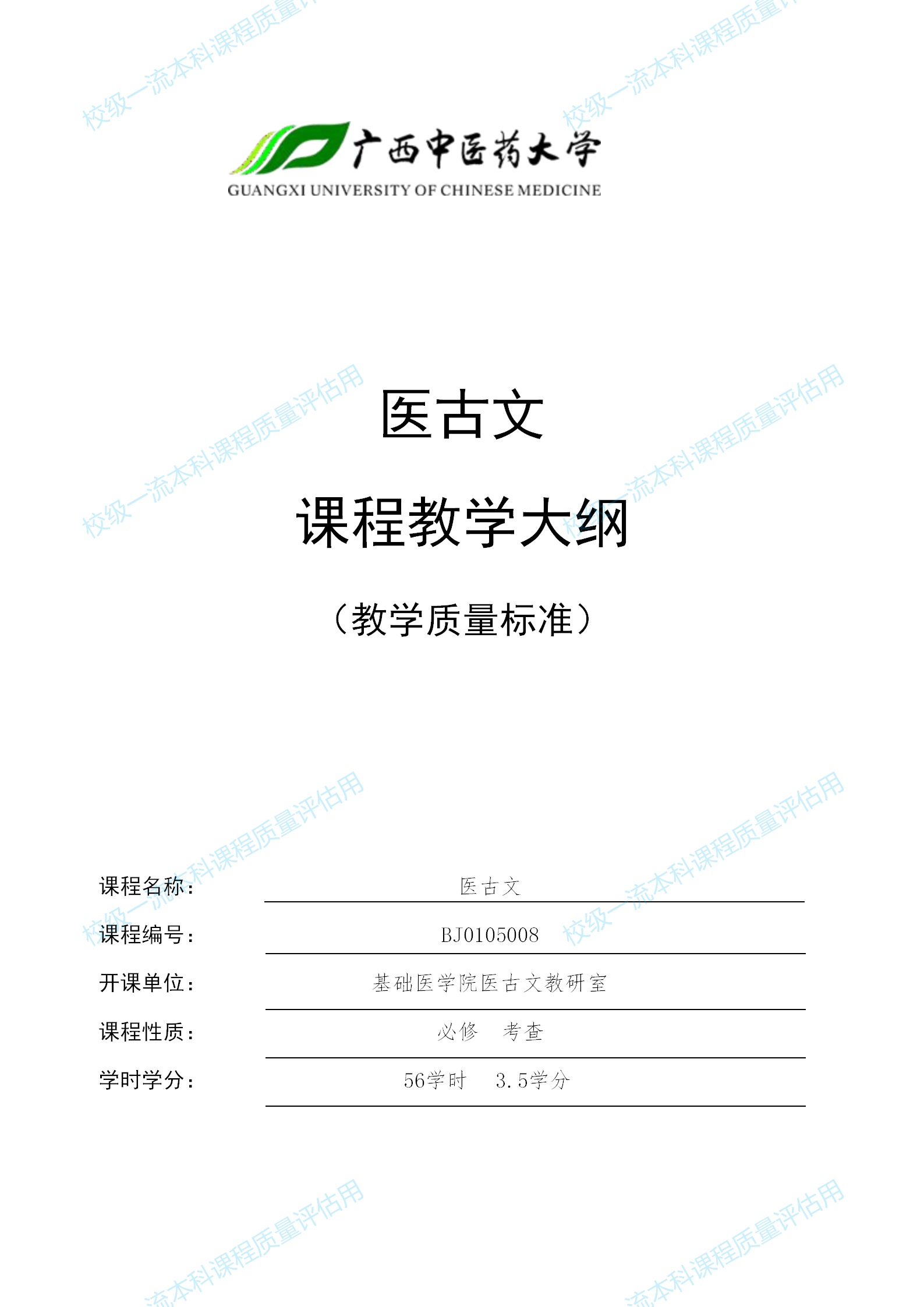 《医古文》教学大纲(新)【校级一流本科课程质量评估用】 来源:医古文教研室 作者:医古文教研室 发布时间:2021-03-08 11:48:45 浏览次数: 次 【字体:小 大】 【校级线上线下混合式一流本科课程质量评估材料】 《医古文》教学大纲(2020年版) (课程质量标准) 点击图片或链接浏览:/UploadFiles/jys/2021/3/202103081148389610.pdf 分享到: 【打印正文】