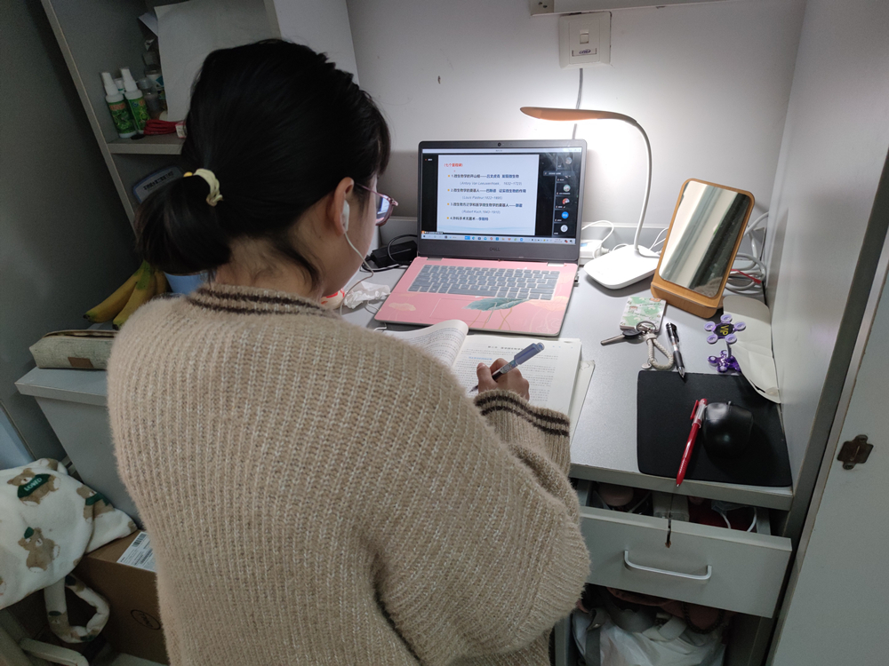 学生在宿舍认真听网课