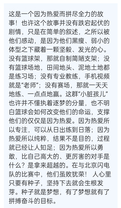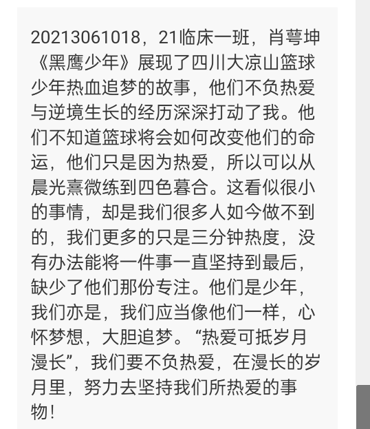 本次活动中,同学们共同观看了电影《黑鹰少年》。这部电影讲述了来自凉山州彝族自治区阿沙莫村的瓦尔阿木克在艰苦的条件中,带领大凉山里的孩子们不畏艰苦,以坚韧、勇敢、不服输的精神,凭借篮球走出大凉山的故事。在观影过程中,同学们全神贯注,与电影中的主人公们一起体会在艰难环境中追逐梦想的心路历程,同时也为电影人物的励志表现而深表感动。观影后,参与的同学们还申请发表观后感,表达观影后的启发和感受。