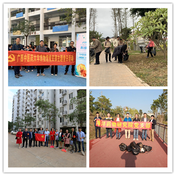 博物馆党支部先后开展了国庆假期庆祝新中国成立70周年专题展义务讲解和参加2019南宁市云景路小学科技节活动,为小学生开展人体模型展示和叶脉书签制作,宣传人体健康知识和医药文化,增强中医药传统文化的自豪感。科学实验中心党支部在学校仙葫校区职工生活区开展了为小区住户检测甲醛和室内空气有机物总挥发性化合物活动以及小区外环境清洁活动;教学实验实训中心党支部和海洋药物研究院党支部分别在仙葫校区门前邕江边开展“保护母亲河”行动和到龟山滨江公园开展主题为“倡导绿色环保,义务捡拾垃圾”党日活动。