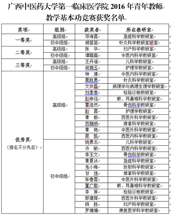 为进一步提高我院青年教师教学能力,促进青年教师发展,同时也为选拔种子选手代表学校参加教育部于2016年8月在长春中医药大学举办的第四届“中医药社杯”全国高等中医药院校教师发展论坛暨青年教师教学基本功竞赛,第一临床医学院举办了2016年青年教师教学基本功竞赛。竞赛以“促进教师职业发展,提高教师教学能力”为目的,采取教研室、学院两级竞赛方式,先由各教研室先行组织教研室内部竞赛,在教师广泛参加、普遍受益的基础上,选拔和推荐教师再参加到院级的决赛。