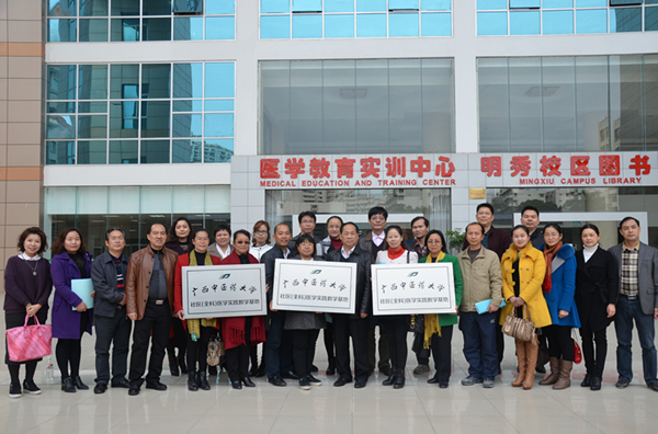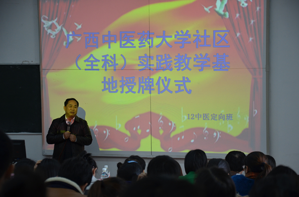 2016年3月10日下午,Beat365中国唯一官方网站社区(全科)实践教学基地授牌仪式在明秀校区西梯一教室举行。Beat365副校长罗伟生、教务处处长唐梅文、副处长刘武、学校与第一临床医学院相关科室领导老师及南宁市十六所社区(卫生院)医疗服务中心的领导共25人出席了本次活动。2012级中医学(农村订单定向医学生免费项目)专业全体同学一齐参加。