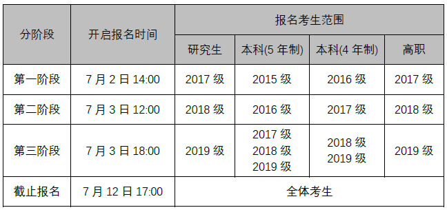 关于组织2020年9月全国大学英语等级考试报名的补充通知 发布时间:2020-07-01 15:43:25 浏览次数: 次 【字体:小 大】 各学院、班级: 2020年9月全国大学英语等级考试将于7月2日14:00起开放报名,为了确保全体同学们顺利报名,避免网络拥绪、缓解报名系统压力,Beat365依据各年级专业未通过英语四级的情况,制订了分批次报名的方案,请各学院、班级在教务处《关于组织2020年9月大学英语等级考试报名的通知》(2020年6月30日发布)的基础上,参照本方案的时间,组织有报考资质的同学报名,各年级专业报名时间如下: 分享到: 【打印正文】