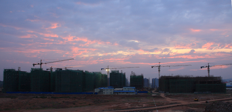 朝霞满天时,信息网络中心工作人员已深入新校区建设工地拍摄