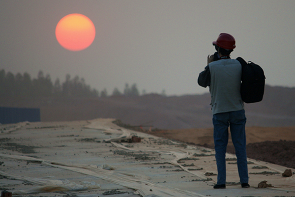 太阳落山的时候,信息网络中心工作人员仍在新校区建设工地记录新校区建设