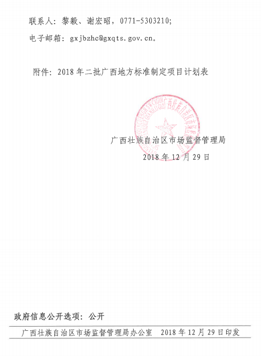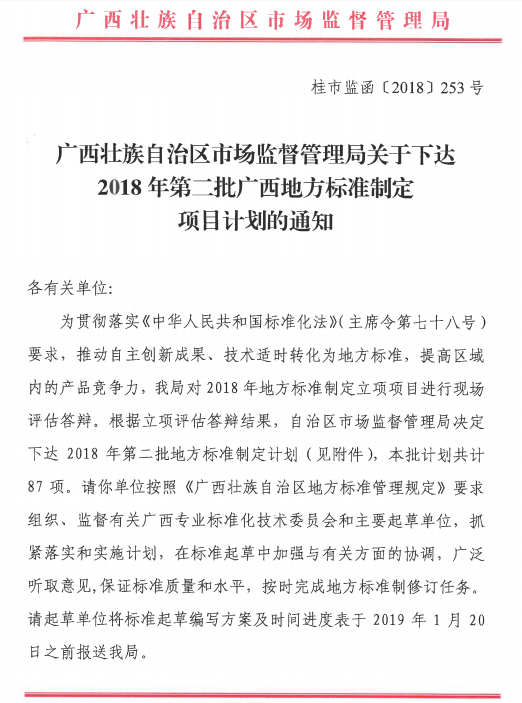 近日,根据《广西壮族自治区市场监督管理局关于下达2018年第二批广西地方标准制定项目计划的通知》(桂市监函[2018]253号)获悉,Beat365有4个项目被自治区市场监督管理局立项,成为2018年第二批广西地方标准制定项目,立项名单详见表一。
