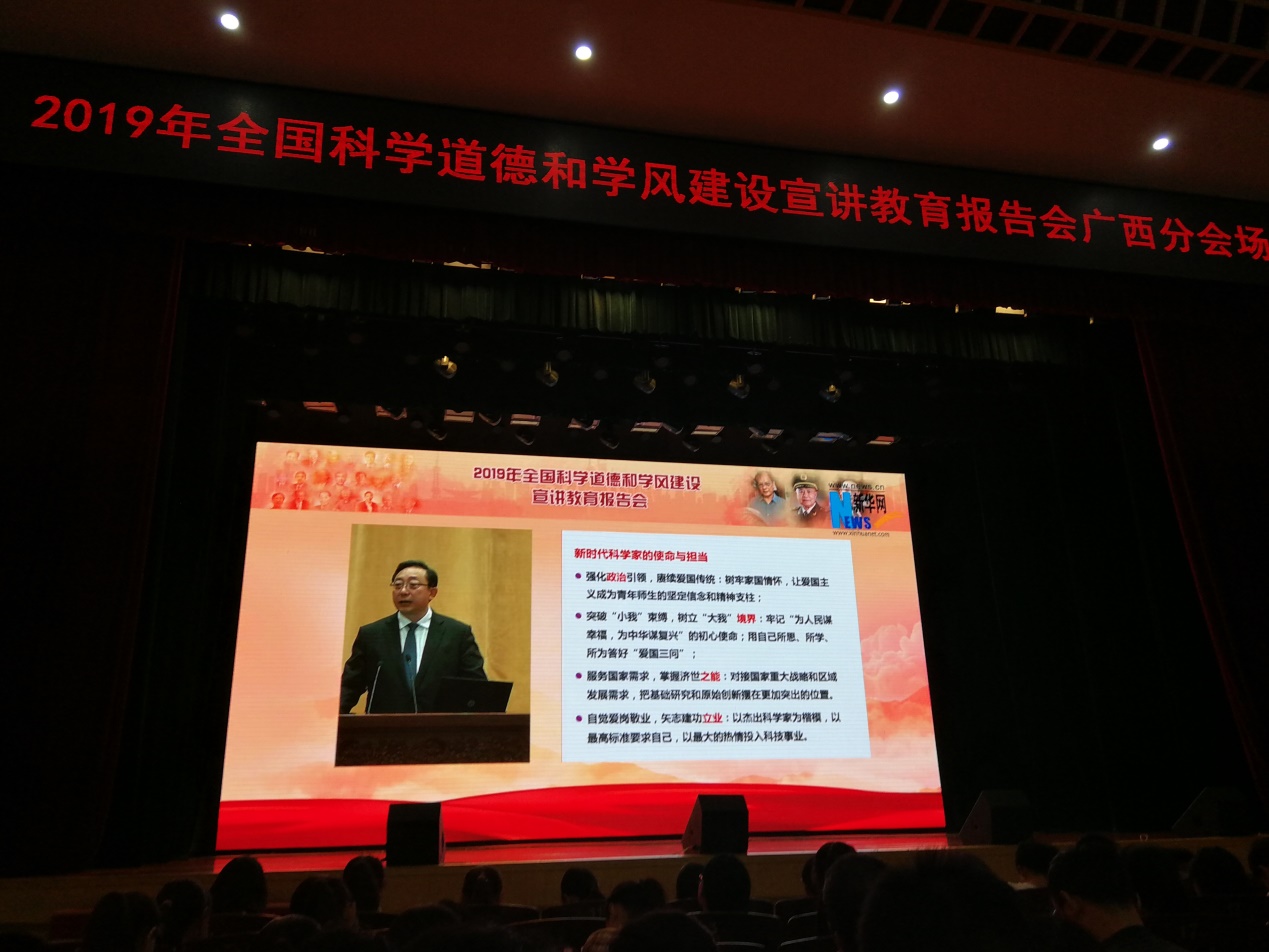 11月13日,2019年全国科学道德和学风建设宣讲教育报告会在人民大会堂举行。Beat365组织青年教师、研究生、本科生200名师生代表赴广西大学大礼堂同步直播分会场,同时积极组织各学院、附属单位共500多名师生通过网络视频同步收看了报告会。
