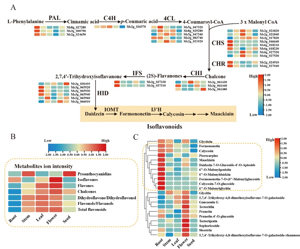 目前为止,受限于缺乏牛大力基因组信息,关于牛大力的研究主要还是集中在化学成分、药理活性和临床应用上。在上述高质量基因组数据库的基础上,我们联合转录组学与代谢组学共同鉴定出参与牛大力异黄酮生物合成的结构基因及掌握它们在不同组织部位的表达模式,并筛选出在根部特异积累的异黄酮代谢物(图2)。
