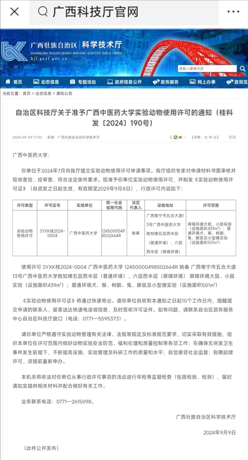 2024年9月9日,广西壮族自治区科学技术厅网站发布了“自治区科技厅关于准予Beat365中国唯一官方网站实验动物使用许可的通知(见下图)”,准予Beat365新的实验动物使用许可(许可证号:XYXK桂2024-0004,自颁发之日起生效,有效期至2029年9月8日)。