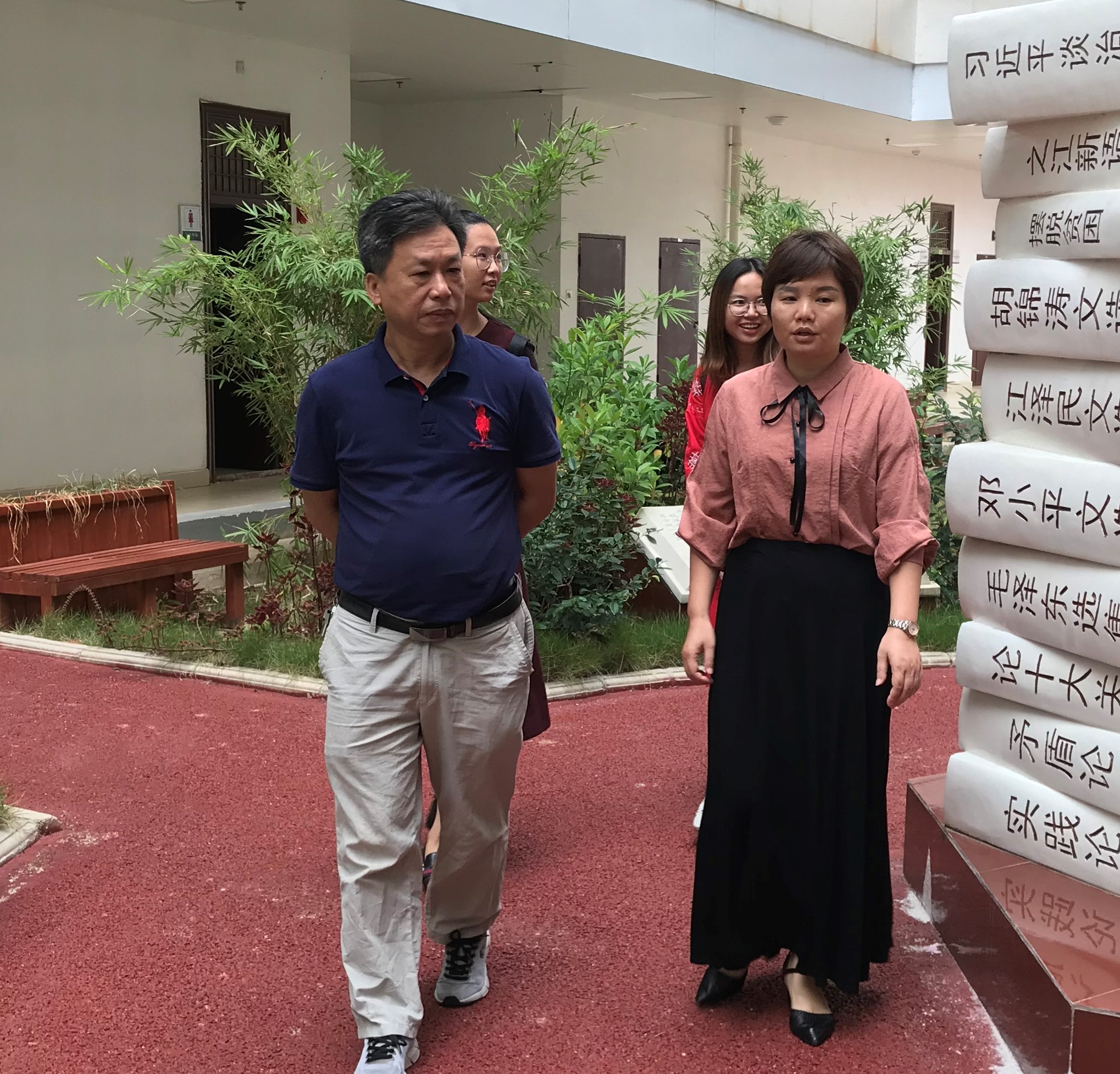在石副院长的安排下,首先参观“马克思主义大众化广场”。“马克思主义大众化广场”是建立在学生宿舍内部的具有浓厚的马列氛围的文化广场,进入广场首先映入眼帘的是一幅刻有“马克思主义学院”院标的浮雕,浮雕上展示的是马克思和恩格斯的头像及他们的德文经典著作;走进广场,视野顿时开阔,花草芬芳,内部铺设塑胶道,建有休憩小凉亭,沿着小道可以边散步边研读马列经典著作,思考哲学问题,累着就在凉亭下休憩;广场两边的走廊分别是马克思主义大众化教育馆,党员活动室、马克思主义大众化学术报告厅,图书资料室等马院特设的机构部门,内部建设也极具马院的定位和特色。