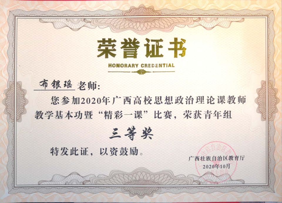 根据自治区教育厅关于举办2020年全区高校思想政治理论课教师教学基本功比赛暨“精彩一课”评选活动通知(桂教工委宣【2020】10号),我院形式与政策教研室布银瑶老师参加2020年全区高校思想政治理论课教师教学基本功比赛暨精彩一课评选青年组荣获三等奖。