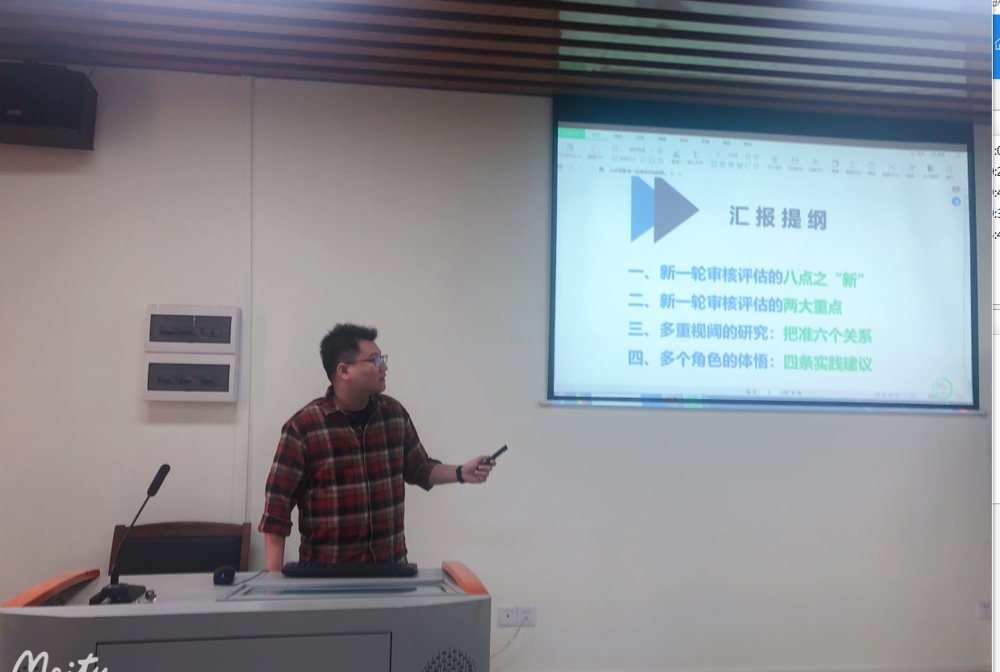 李源副院长以《新一轮普通高校本科教育教学审核评估的目标指向与实践要求》为题,从目标指向、总体框架和实践要求三方面,解读了新一轮审核评估的重要意义、考察重点、突出特点和新变化新要求,并结合学院发展方向和特色等,与我院教师的互动交流,就构建多元化人才培养体系、做好教师教学和思政教学改革等工作做了全面总结与汇报。