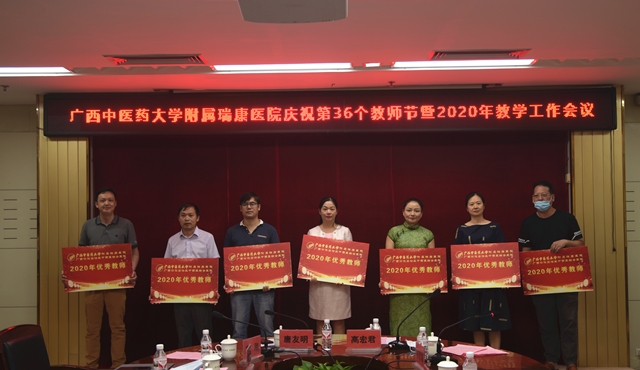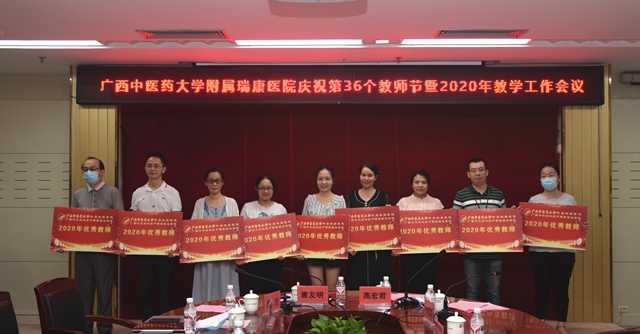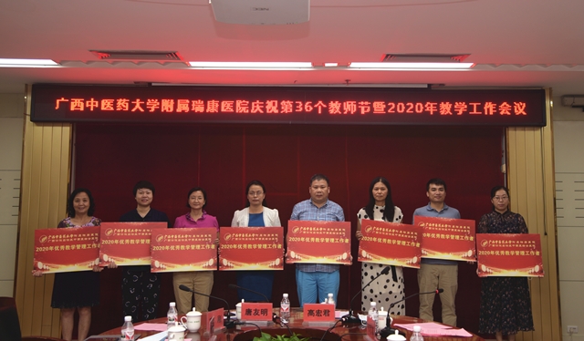 韦思尊宣读表彰文件。与会领导逐一给2020年优秀教师、教学管理工作者,以及2019年度住培优秀责任导师、优秀带教老师、优秀科室主任、优秀住培管理工作者颁奖。