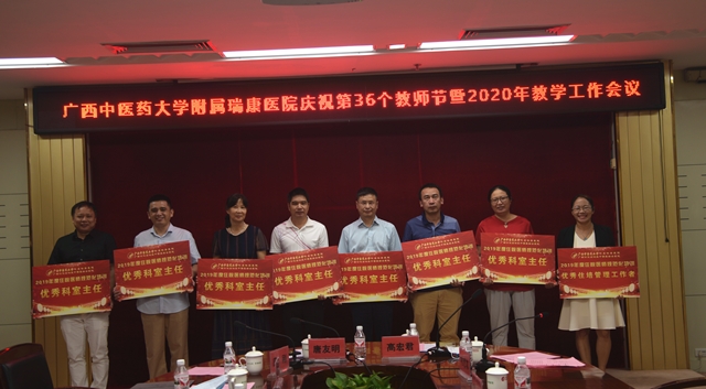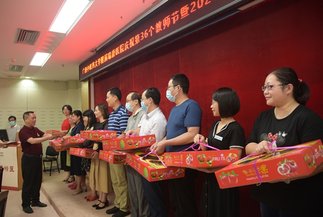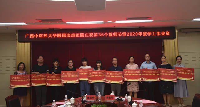 金秋九月,丹桂飘香。在第36个教师节即将来临之际,9月7日下午,我院召开第36个教师节庆祝大会暨2020年教学工作会议。院长唐友明,党委书记高宏君,党委副书记、副院长陈日兰,副院长、总会计师庞刚,副院长韦思尊,纪委书记黄建民,副院长陈锋、宋策出席会议,并向全院14个教研室代表赠送果篮和慰问金,祝愿老师们桃李满天下。各教研室、行政职能部门、临床医技科室负责人,教学秘书、获表彰人员、教师代表、住培学员代表、实习生代表等参加会议。大会由高宏君主持。
