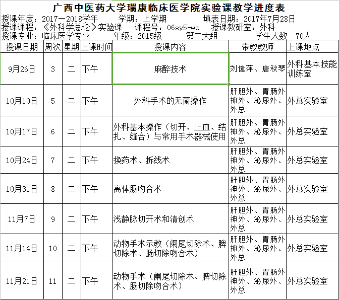 15级临床第2大组《外科学总论》实验课进度表