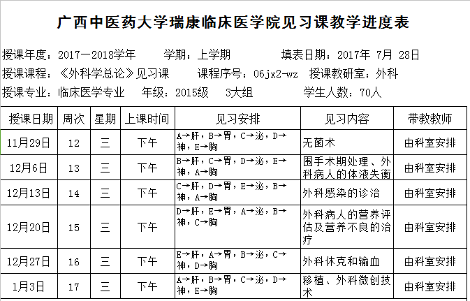 2017-2018上15级临床第3大组《外科学总论》见习进度表
