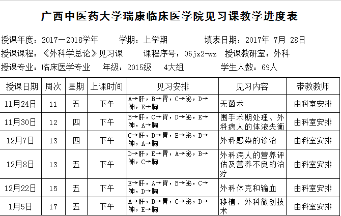 2017-2018上15级临床第4大组《外科学总论》见习进度表