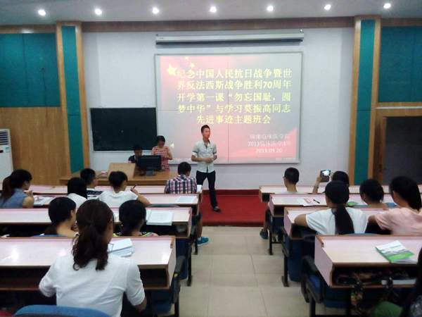 为落实校党委的号召,做好中国人民抗日战争暨世界反法西斯战争胜利70周年纪念活动的宣传工作,宣传伟大的抗战精神,对学生进行爱国主义和革命传统教育,瑞康临床医学院教务学生党总支于2015年9月期间以班级为单位开展“勿忘国耻,圆梦中华”开学第一课专题教育活动。活动旨在加深我院学生对抗日战争和世界反法西斯战争的认识,弘扬伟大的抗战精神,激发学生的爱国热情,引导和激励学生凝心聚力,在学习生活中学会以史为鉴,增强忧患意识,努力学习,报效祖国。