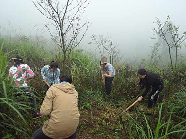 阳春三月,草长莺飞, 绿城南宁正值一年一度的“回南天”气候,半月的阴雨连绵使得土地泥泞不堪。在我院的规划地里,老师与同学们在林场工作人员的指导之下,克服了半人高的野草与湿滑坡地的障碍,用锄头开出一条三米宽的山路。