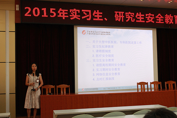 为了进一步加强对我院实习生、研究生的管理,提高学生安全意识,7月22日下午,我院教务学生部在医院十楼第七教室召开全体实习生、研究生安全纪律教育大会。医院党委副书记、纪委书记陈日兰出席本次大会,教务学生部副主任汪国翔老师、粟俊老师以及我院全体实习生、研究生共613名学生分四批参加了大会。
