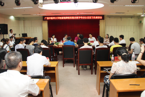 根据模拟认证议程安排,医院领导与临床教师座谈会、实习生座谈会分别以问题为导向进行,采取提问的方式考察大家对临床医学专业认证知识的把握程度。在医院领导与临床教师座谈会上,分别考察了医院怎么处理好教学与医疗的关系、近年来做了哪些教学改革、妇产科学在临床医学专业培养中的课程目标、在理论教学与临床实习带教中怎样培养学生临床思维和临床能力、对形成性评价的了解情况及如何开展、在临床带教过程中怎么做实习量化考核、在认证工作开展一年里做了哪些以“学生为中心”的工作等7方面。在实习生座谈会上,主要提问了实习生到医院实习多长时间、实习过哪些科室、主要做了哪些工作、出科考试主要以什么形式考核、对在瑞康医院实习是否满意、实习过程中老师是怎么带教的、“三早教育”内容及有关经历、实习前有无进行过任何形式的培训等8个问题。会上医院领导、教师及实习生都表现积极、畅所欲言。