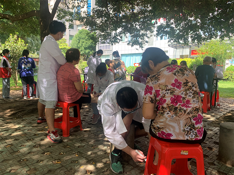 义诊活动从量血压、艾灸、按摩、心肺复苏宣讲等方面开始,前来参与活动的居民络绎不绝,志愿者们精神饱满,认真为居民进行测量血压、艾灸等各项活动。此外,志愿者们针对每个居民的不同情况,耐心地叮嘱他们各种日常注意事项,详细介绍防病和养生知识,提出合理的膳食、运动等生活指导,做到“未病先防”“既病防变”“预后防复”。一位退休老党员在接受了志愿者的艾灸体验后,对本次义诊活动高度赞扬,他说:“你们都是国家的未来,一定要好好学习,将来都成为好医生。”这几句朴实无华的话语让在场的同学都感触颇深,大家表示一定会努力学好专业本领,将来在工作岗位中更好地为人民服务。