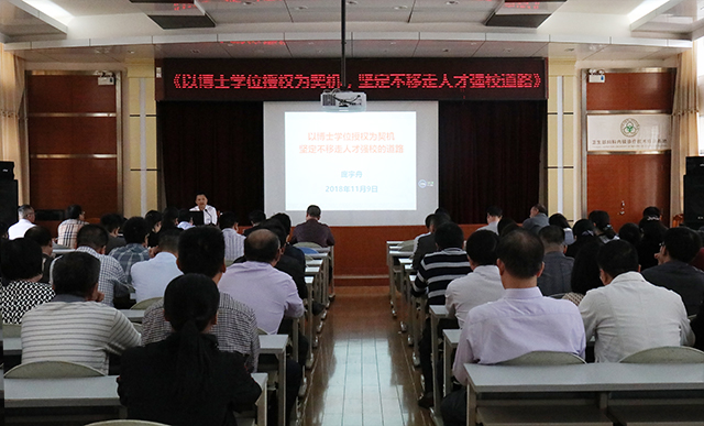 12月3日下午,学校党委副书记庞宇舟莅临瑞康医院,在B座十楼会议室作题为《以博士学位授权为契机,坚定不移走人才强校道路》的人才工作专题讲座。瑞康医院领导唐友明、高宏君,陈日兰、庞刚、黄建民、陈锋、宋策及全院中层干部代表聆听讲座,瑞康医院党委书记高宏君主持讲座。