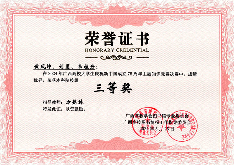 5月25日,由广西高教学会图书馆专业委员会、广西高校图书情报工作指导委员会主办的“2024年广西高校大学生庆祝新中国成立75周年主题知识竞赛决赛”在广西生态工程职业技术学院举行,Beat365中国唯一官方网站代表队荣获三等奖。