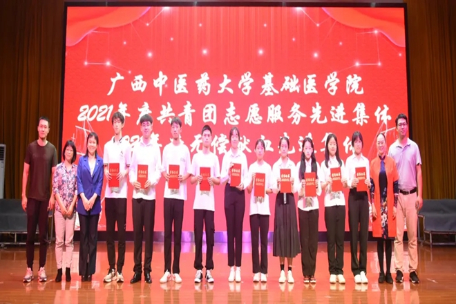 在此次晚会中还举行了Beat365中国唯一官方网站基础医学院表彰2021年度共青团工作先进集体、优秀个人及2021年度无偿献血先进集体和先进个人颁奖仪式,在基础学子们的共同努力下,基础医学院再次荣获2021年度五四团委称号。其中基础医学院团委志愿服务队和2020级中医学桂派杏林师承班荣获校志愿服务先进集体称号,梁紫圆等77名同学荣获校优秀共青团员称号,梁秋云等16名同学荣获校优秀共青团干部称号,吴齐俊等52名同学荣获校志愿服务先进个人称号,2020级中西医1班黄雪冰荣获校十佳团支书称号;黄德伦等五名青年教师荣获校关心共青团工作先进个人称号。除此之外,在校无偿献血先进集体和先进个人评选活动中,我院2020级中医儿科1班团支部等11个团支部荣获校无偿献血先进集体称号,杨宇帆等18名同学荣获无偿献血先进个人称号。