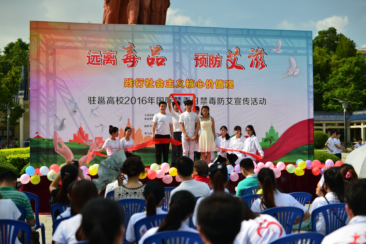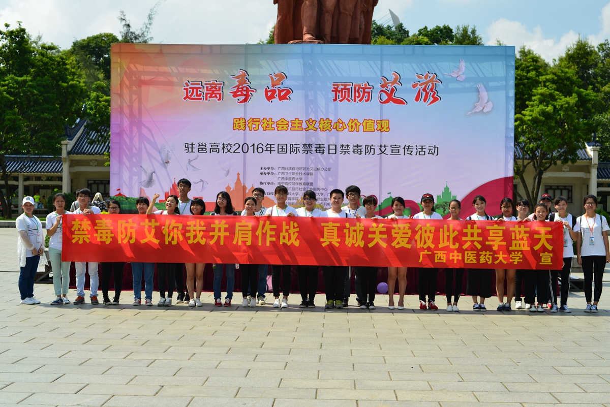 6月26日是第十八个“国际禁毒日”,一场“远离毒品,预防艾滋,践行社会主义核心价值观”驻邕高校2016年国际禁毒日禁毒防艾宣传活动在南湖公园举行,来自驻邕13所高校的志愿者用文艺演出、趣味游园活动向市民宣传了禁毒和艾滋病预防的知识,用行动响应今年的“国际禁毒日”“拒绝毒品诱惑、拥抱阳光生活”的主题,进一步促进我区禁毒宣传工作的深入开展,充分调动广大群众参与禁毒防艾人民战争的积极性。