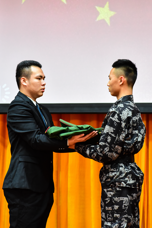 黄英老师为5名15级的同学进行颁奖,15级队员为16级队员授服、授章和授旗。最后,黄英老师进行总结。她指出国旗护卫队代表着Beat365的形象,日常的艰苦训练培养了一支英姿飒爽的队伍。当大家接过手中的旗帜时,要明白这是一份担当与坚守,希望我们能够秉承“弘毅自强,传承创新”的精神。