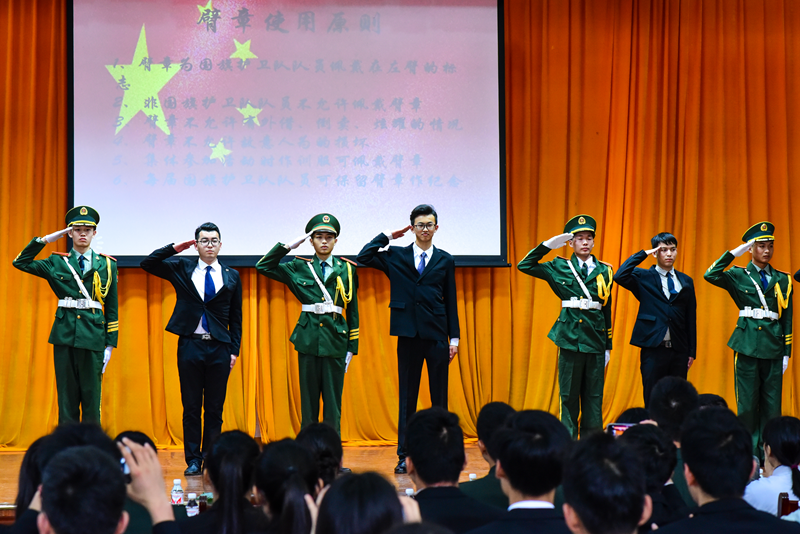 国旗护卫队发展至今,一直以作训严格,风气优良著称。大会开始,奏唱中华人民共和国国歌。武保部王怿清老师肯定了国旗队在传统保健运动会等多个大型活动上出色地完成任务,本次换届大会给国旗护卫队注入新鲜血液,希望新任同学再接再厉。