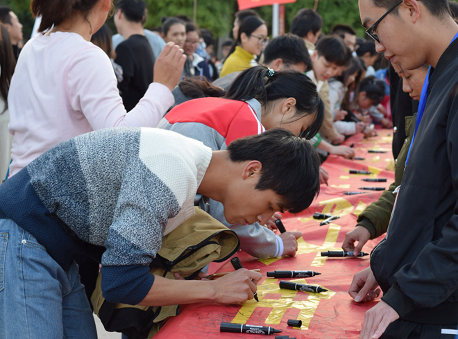 抵达Beat365医圣广场时,同学们集中在一起,在横幅上签下了自己的名字。热腾腾的气息随着笔墨一同烙印在横幅上,鲜红的横幅仿佛被赋予了生命般熠熠生辉。