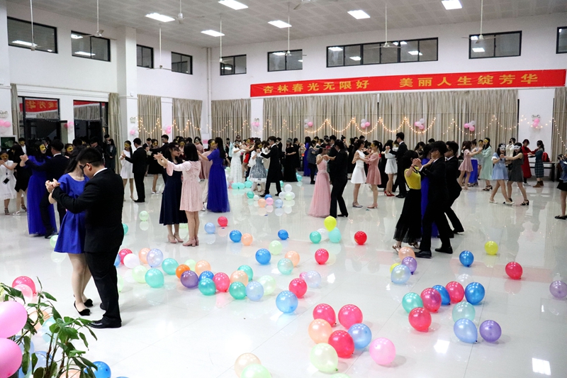 舞会开始前,男生女生结伴在小礼堂进行交谊舞现场教学。现场的同学各个带着面具,不认识彼此,在节拍中彼此融合,不久同学们的舞步逐渐熟练。