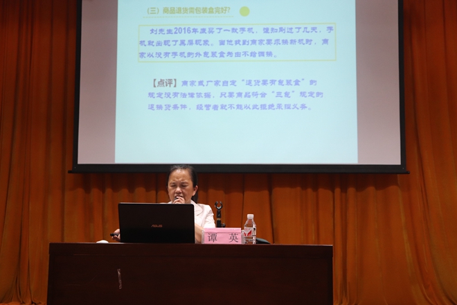 3月15日,广西消委会专家谭英在小礼堂作“解读新《广西消费者权益保护条例》法规”的主题讲座。讲座通俗易懂、深入浅出。谭英老师联系实际,以案释权,解读了一个个生动鲜明的维权例子,讲解了新《广西消费者权益保护条例》法规、消费者享有的权利、消费争议的解决途径等知识。讲座过程中,她针对学生们的提问进行了耐心地解答,互动气氛十分活跃。