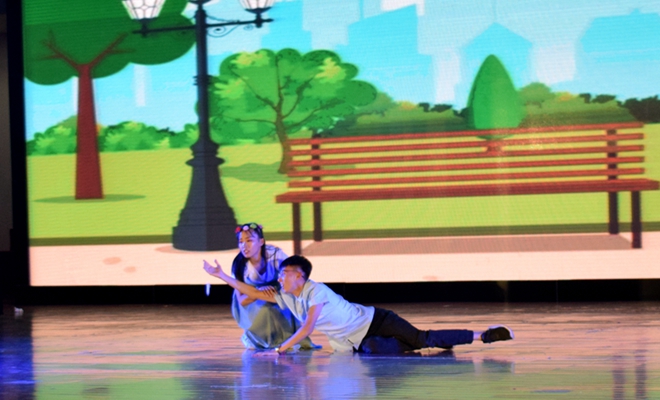 所谓舞台剧,是一种呈现于舞台的戏剧艺术。这次比赛同伴准备了节目《花落》,它打破常规题材的束缚,另辟蹊径,以舞台剧的形式宣传防艾知识,意在跨越人们内心的防线。该剧主要讲述了一个大学生因为吸毒感染上了艾滋病,后来在与女友发生性行为时没有做好安全措施,两人都不幸成为了艾滋病患者,最后得到志愿者帮助的故事。《花落》呼吁了人们要远离毒品,学会保护自己,更要关心和帮助艾滋病感染者。