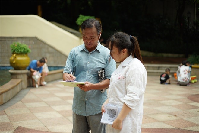 在南宁市凤岭山语城小区,“献血为盟”小组选择在人流量相对较多的正门树荫下开始为期半天的社会调查及知识普及活动。场地迅速布置好后,小组员们对人来人往的居民进行问卷调查,现场居民对小组员们十分友善,积极配合活动开展。每位居民认真填写完调查问卷后,组员们现场将错误答案及时向居民解释清楚,并认真讲解其中关于献血的注意事项。并向居民免费发放献血知识小手册,积极鼓励居民及其亲友参加献血。正午时分,艳阳高照,但组员们的热情却没有退却。居民在小组员的热情感染下,纷纷表示今后将积极参与公益献血活动,与组员们挥手道别,人群渐渐退去,本次“献血”知识普及活动也圆满落幕。