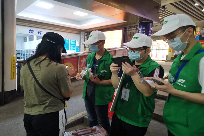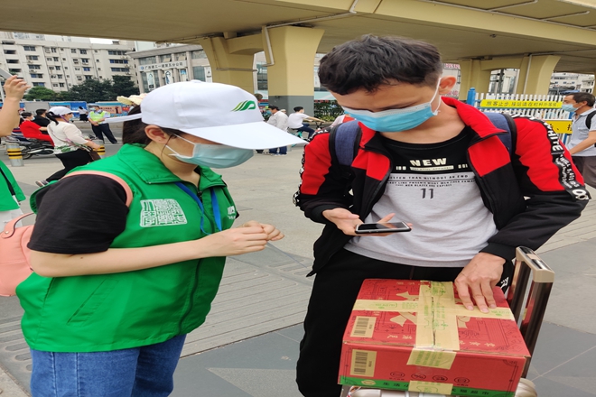 4月21号早上七点,志愿者们整装待发,到达站点后立即紧锣密鼓地工作。他们身穿绿色小马甲,头戴白色帽子,来回奔波于各接站口和上车点。在现场,志愿者们对到站的同学进行身份信息核查、健康核验、基础消毒、体温检测、乘车登记等工作。虽然站点人流量大,天气比较炎热,但志愿者们工作却没有丝毫松懈和抱怨。每个志愿者都坚守在自己的岗位上,工作进行得有条不紊。一直持续到晚上将近11点,才圆满结束当天的站任务。
