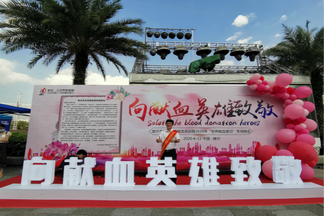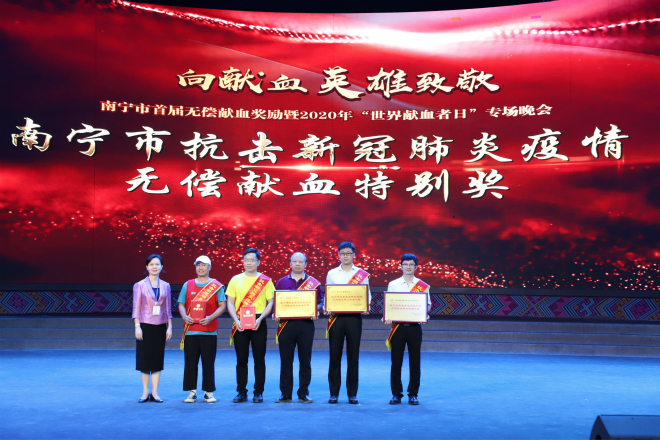为迎接第17个世界献血者日,致敬全市无偿献血者,2020年6月13日晚8点,南宁市开展首届向献血英雄致敬——无偿献血奖励暨2020年“世界献血者日”主题晚会。晚会表彰了2019年度为无偿献血事业做出贡献的单位和个人。Beat365荣获“南宁市无偿献血促进奖单位奖”、“南宁市抗击新冠肺炎疫情无偿献血特别奖”,王春花同志荣获“南宁市无偿献血促进奖个人奖”。